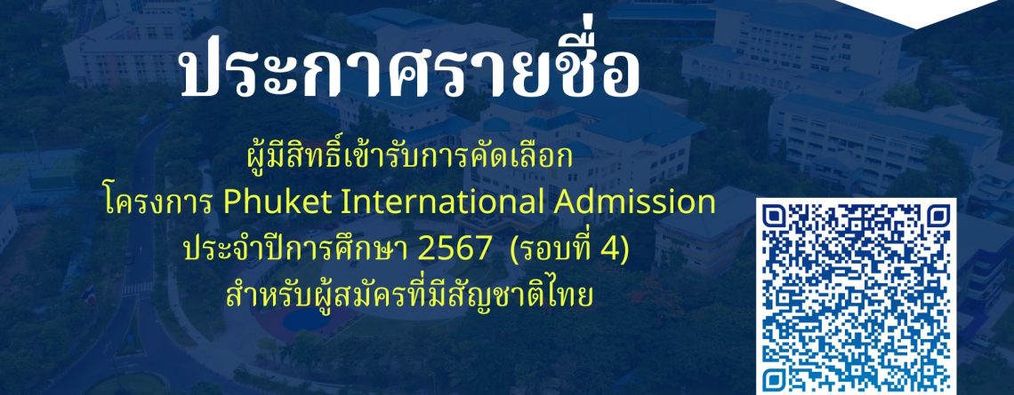 ประกาศรายชื่อผู้มีสิทธิ์เข้ารับการคัดเลือกโครงการ Phuket International Admission ประจำปีการศึกษา 2567 (รอบที่ 4)